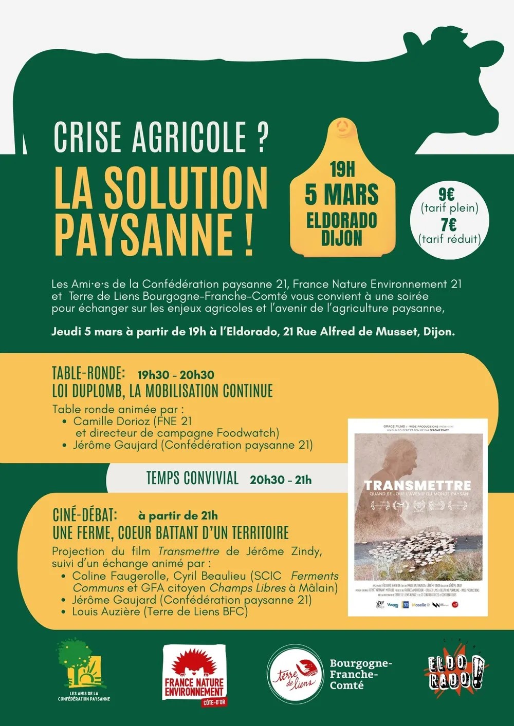 Jeudi 5 mars à partir de 19h au Cinéma l’Eldorado à Dijon, les Ami·es de la Confédération paysanne 21, France Nature Environnement Côte d’Or et Terre de Liens Bourgogne-Franche-Comté organisent un ciné-débat sur un sujet qui nous concerne toutes et tous: la crise du modèle agricole actuel, ses impasses et les solutions.